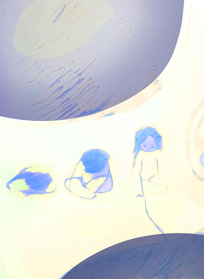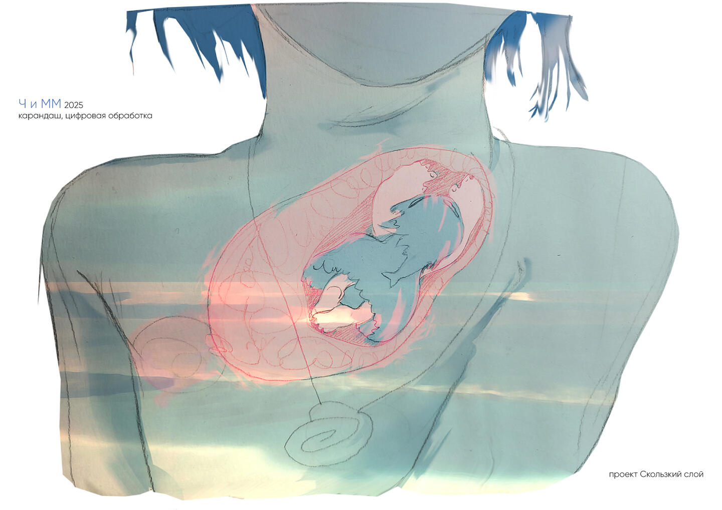 Действие происходит в нереалистичном пространстве, где океан, таз с морскими обитателями, нефтяная платформа и лес становятся нерефлексивными, но живыми существами, а также ложным олицетворением внутренних состояний Ч.Спиральное развитие: каждая глава возвращает героев к схожим ситуациям, но на новом уровне понимания. Ч сталкивается с вытесненными страхами, воплощенными в образе Маленькой Мисс, живущей между шеей и грудью, учится признавать свою уязвимость. П открывает для себя возможность общения и ответственности за осмысленное существо.Визуальный язык проекта расширяет повествование через серию картин, в которых детская эстетика, присущая персонажам истории, сочетается с элементами разрушающего сюрреализма. Живописные образы визуализируют ключевые метафоры сказки. Каждая работа — это срез внутреннего ландшафта персонажей и их восприятия мира.